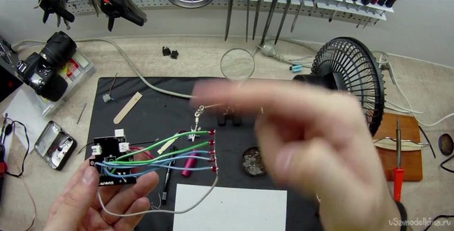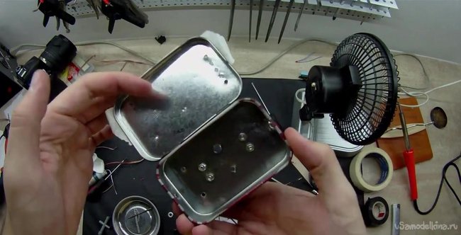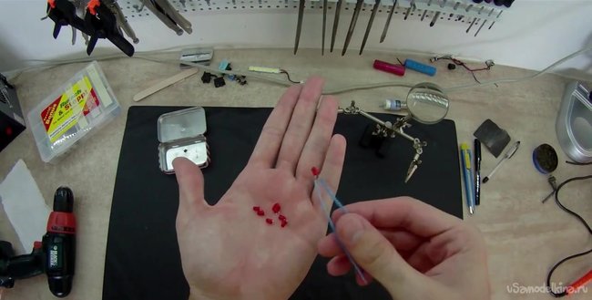 Для эстетичности автор также устанавливает 5 маленьких светодиодов на вольтомметр, выпаяв с него заводские светодиоды. Подключив аккумулятор к вольтметру и замкнув его кнопку можно получить информацию о заряде аккумулятора.