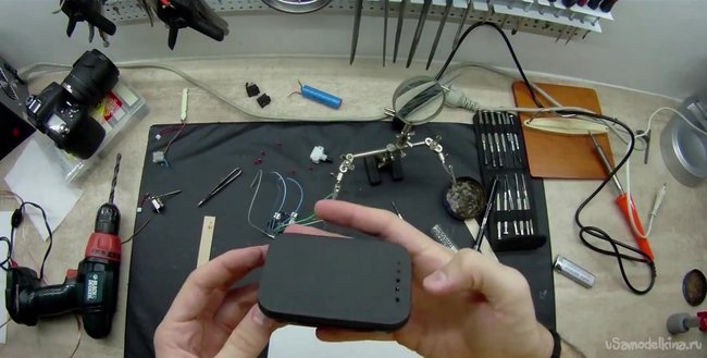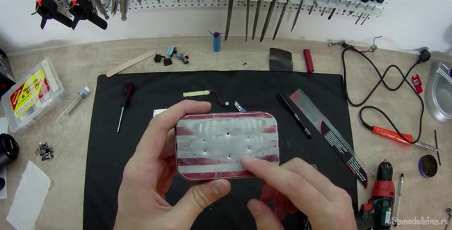 Делаем на коробочке отверстие под кнопочку, пять отверстий под светодиоды и красим коробочку под цвет камеры, то есть скорее всего в черный. Не забываем оставить не покрашенное место для крепления светодиода.