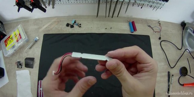 Наконец позаботимся о креплении нашего прожектора. Берем деревянный шпатель и отрезаем от него кусок. Сверлим на нем отверстие, через которое проводим болт, идущий от коробочки. Прожектор также можно использовать как ручной фонарик.