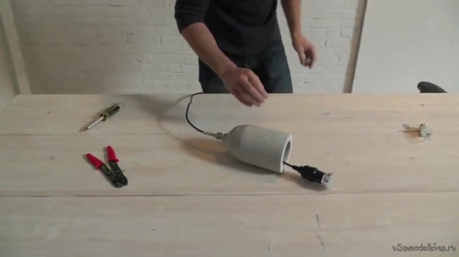 Просовываем провод от патрона через отверстие на верхней части бетонного светильника, накручиваем лампочку и подключаем патрон к источнику питания.