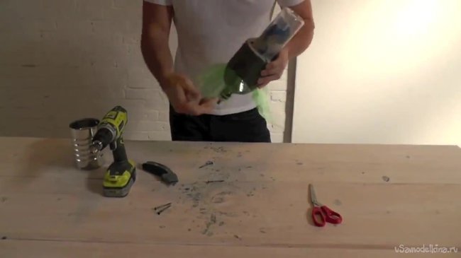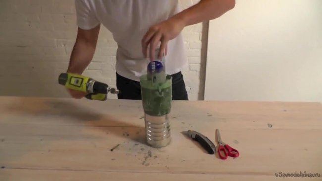 Когда бетон высох, снимаем саморезы, которыми мы прикрепили маленькую бутылку.