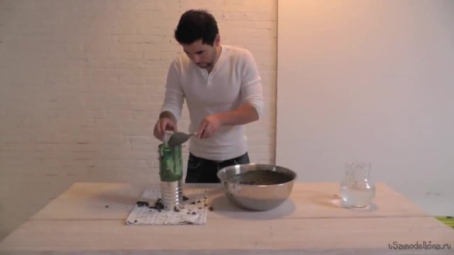 Теперь наливаем полученный бетон в пространство между двумя бутылками.