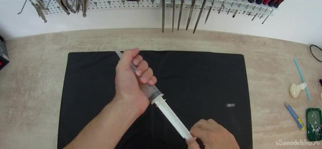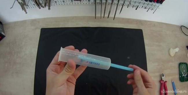 Теперь берем трубочку от напитков, которая должна быть длиннее, чем сам шприц.