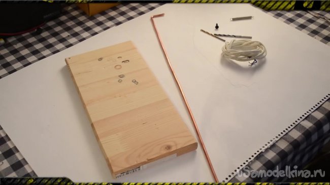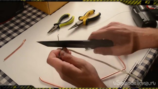 Далее сгибаем нашу медную или стальную проволоку под углом 90 градусов и вставляем ее в отверстие и углубление. Проверяем, чтобы проволока не шаталась. Если все сходится идеально, можно приступать к следующему шагу.