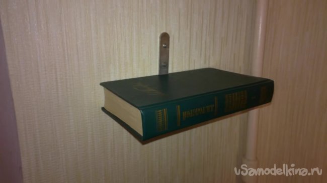 В конце закрываем книгу, которая уже стала своеобразной полкой. Теперь можно смело крепить ее к стене парой саморезов так, чтобы «Г»-образная петля «смотрела» вверх. Таким образом, мы получаем вполне нестандартное решение в интерьере, которое также можно назвать своеобразной зрительной иллюзией, поскольку смотрящему с первого взгляда покажется, что книги висят в воздухе. Такая полка может спокойно выдержать вес 5-6 книг, поставленных на нее.