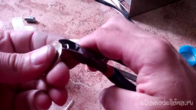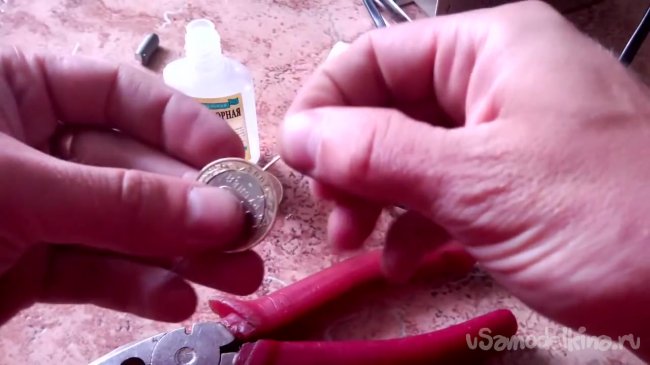 Теперь берем проволоку, нагреваем поверхность монеты и вставляем проволоку в отверстие.