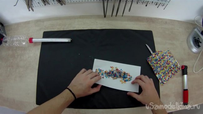 Когда мы это сделали берем трубу и крепим ее на клапан бутылки. Труба в данном случае будет выполнять сразу две роли. Во первых она будет своеобразным спусковым механизмом, а во вторых – в нее мы будем заливать конфетти.