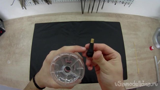 Первым делом нам нужно проделать отверстие на дне крышки. Отверстие должно иметь такой диаметр, чтобы ниппель проходил и держался максимально плотно. От нас добавим, что при желании можно использовать клеевой пистолет для большей герметичности.