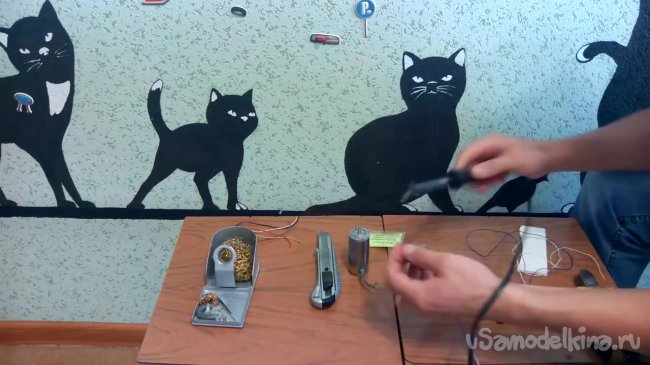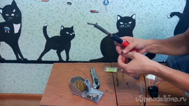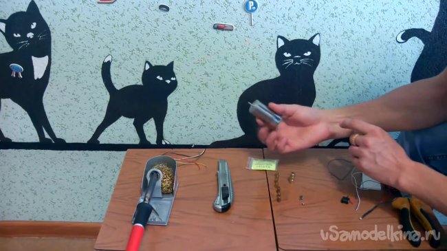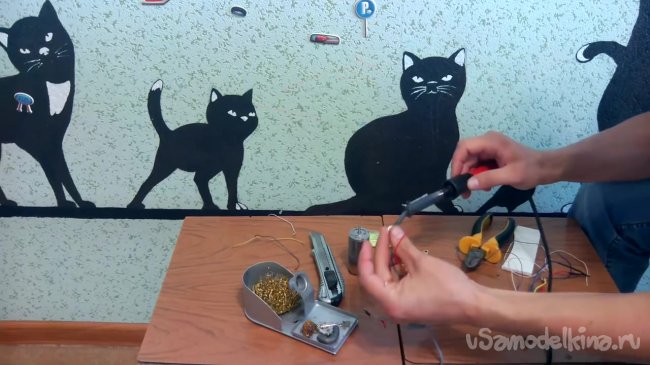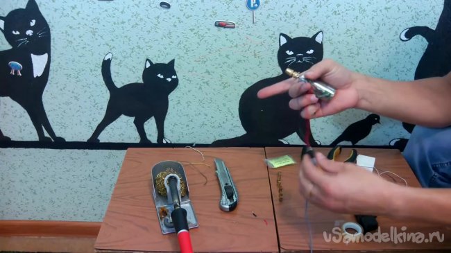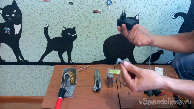 Берем два провода и зачищаем их канцелярским ножом. Затем припаиваем их на плюсовой и минусовой контакты, которые расположены на нашем штекере.