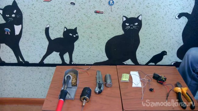 Далее берем кнопку и припаиваем минусовой провод на нее. Для того, чтобы проверить правильно ли мы припаяли провода, достаточно подключить плюсовой контакт от штекера к плюсовому проводу от моторчика, и минусовой контакт кнопки к минусовому проводу от моторчика.