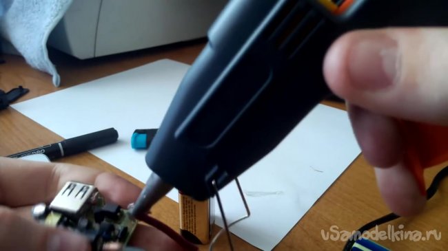Для подключения проводов к контактам на плате автор самоделки не использует паяльника. Вместо этого он просто клеит термоклеем.