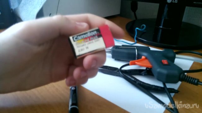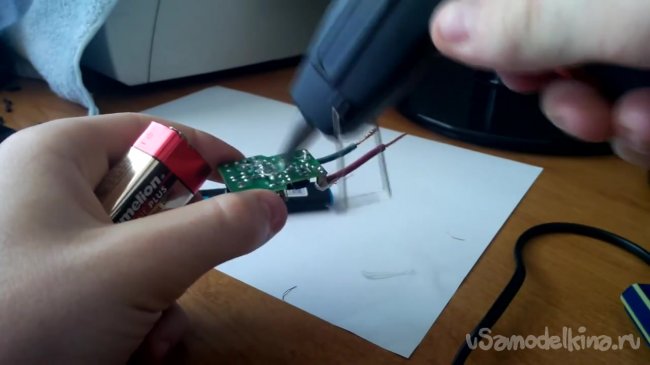 Подводим провода к контактам на батарейке и заклеиваем клеевым пистолетом.