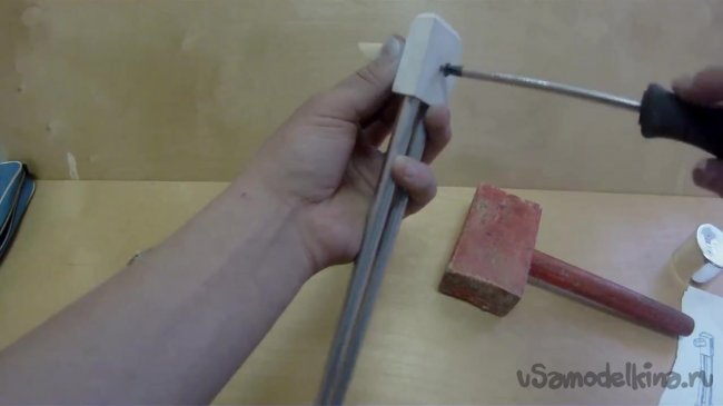 Просовываем металлические трубки в проделанный отверстия. Для большей устойчивости в процессе сборки конструкции слегка забиваем трубы молотком. Делать это нужно поочередно.