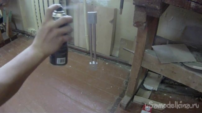 Далее красим полученную конструкцию обычной аэрозольной краской. Автор использует серебряную краску, однако тут дело личного вкуса и личных предпочтений.