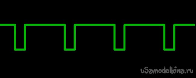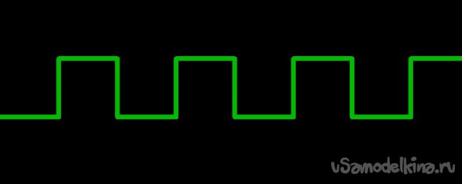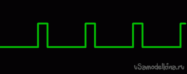 Из нее мы видим что это обычный генератор с регулятором скважности импульсов собранный по схеме из даташита. Резистором R1 мы и меняем эту скважность, резистор R2 служит нам защитой от КЗ, так как 4 вывод микросхемы через внутренний ключ таймера подключен на землю и при крайнем положении R1 он просто замкнет. R3 это подтягивающий резистор. С2 это задающий частоту конденсатор. Транзистор IRFZ44N - это N канальный мосфет. D3 - это защитный диод который предотвращает выхода из строя полевик при обрыве нагрузки. Теперь немного о скважности импульсов. Скважность импульса - это отношение его периода следования (повторения) к длительности импульса, то есть через определенный промежуток времени будет происходить переход от (грубо говоря) плюса к минусу, а точнее от логической единицы к логическому нулю. Так вот этот промежуток времени между импульсами и есть та самая скважность.