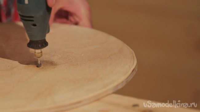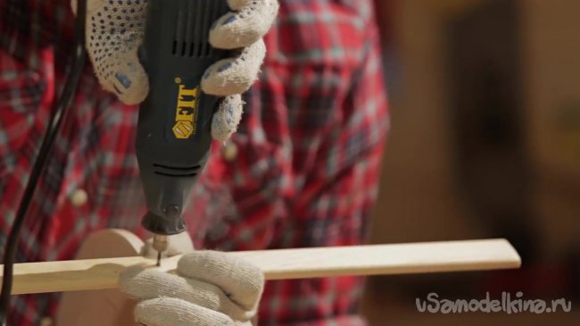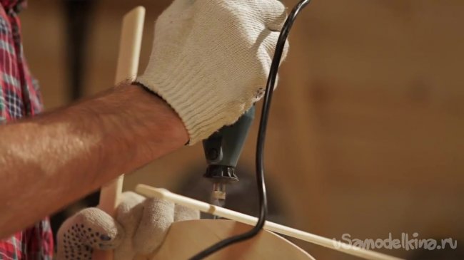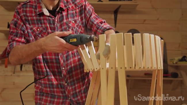Когда все рейки закреплены на круглом основании, нужно позаботиться о том, чтобы они были также закреплены между собой. Для этого берем мини дрель и сверлим отверстия сквозь рейки.