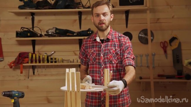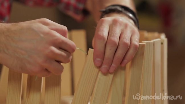 Автор видеоролика выпиливает ножки длиной 40 см и боковые стенки длиной 15 см. У нас должно получиться 9 длинных кусков для ножек и 24 коротких куска. Крепиться эти куски будут группами – три длинных куска, затем 8 коротких, так чтобы у нас получилась конструкция с 3 ножками, состоящими из трех реек и тремя бортиками, состоящих из 8 реек.