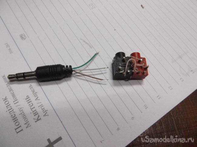 Теперь фиксируем штекер термоклеем, припаиваем проводки штекера к запараллеленым разъемам