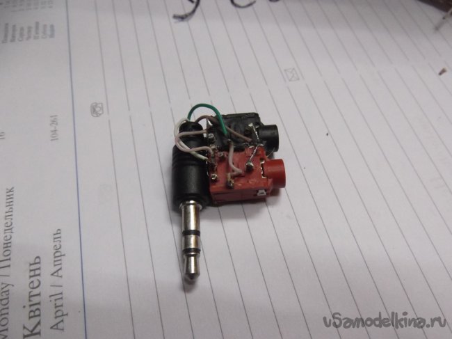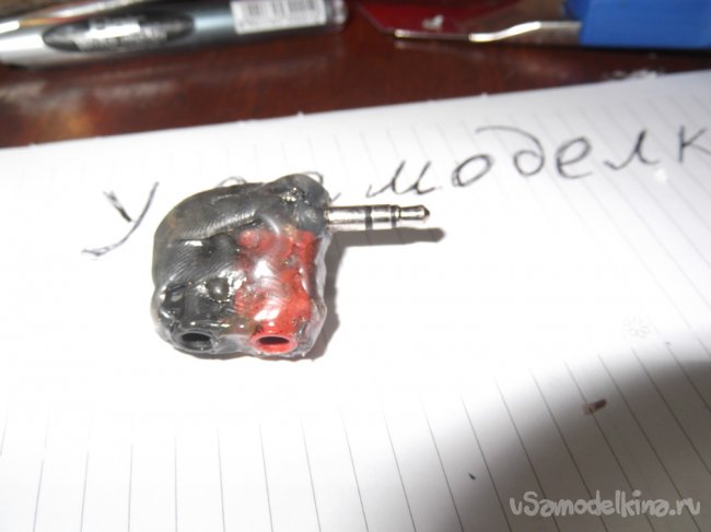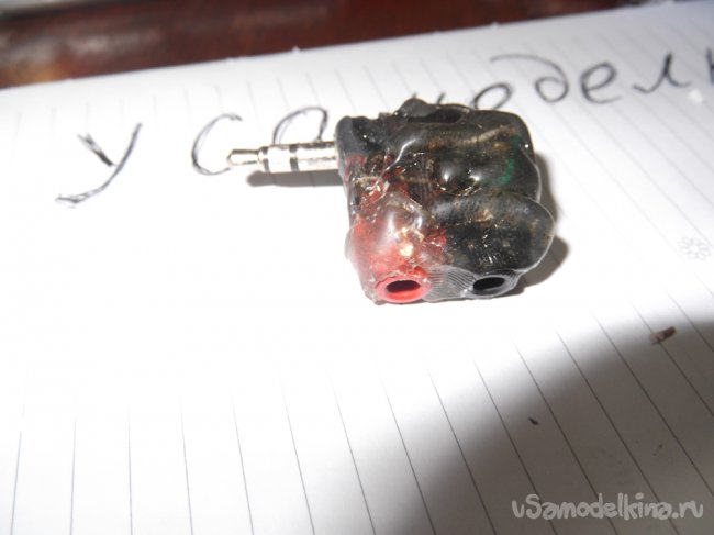 Когда все готово, вставляем разветвитель в телефон, плеер, планшет, или ноутбук для проверки работоспособности, если все работает то можно приступить к финальному этапу – залить всю конструкцию термоклеем как показано на фото