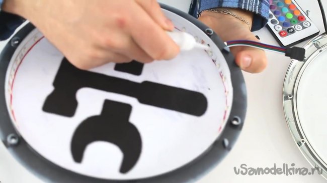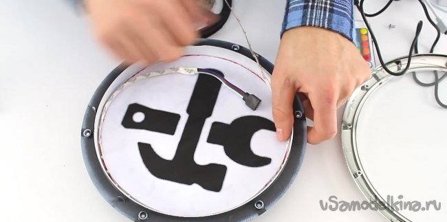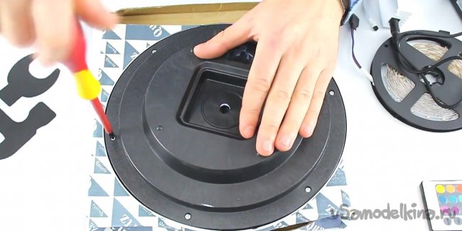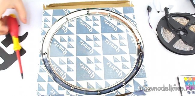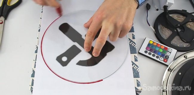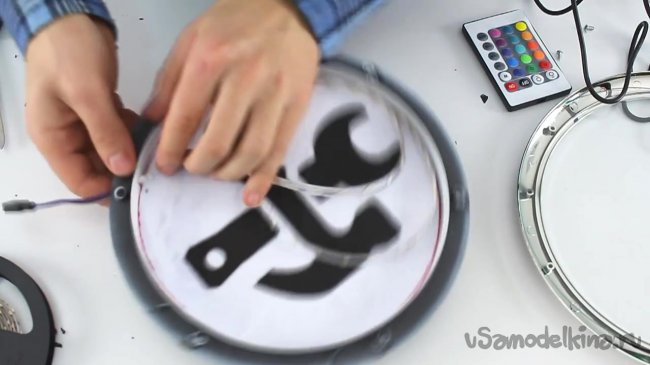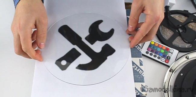 Вначале отметим, что автор самоделки использует так называемую RGB светодиодную ленту, которая идет в комплекте с пультом управления, позволяющим регулировать цветопередачу светодиодных лампочек.