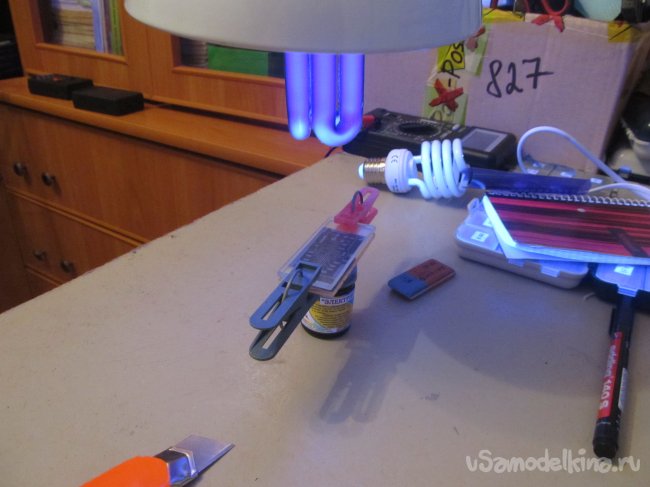 Вкручиваем лампочку в любой светильник и выставляем над нашей платой на высоте где то 10-20 см. И включаем, время засветки от такой лампы как на фото на высоте 15 см у меня составляет 2,5 минуты. Дольше не советую, можете испортить фоторезист