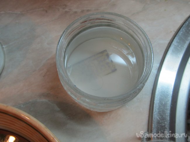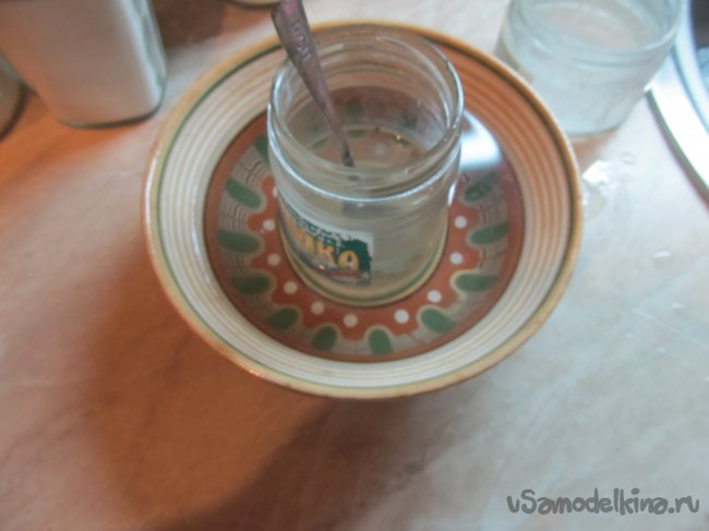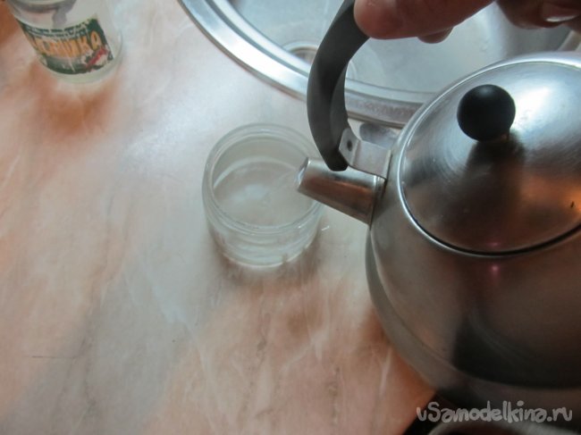 Раствор нужно подогреть, берем миску, наливаем туда теплую воду и ставим тару в миску