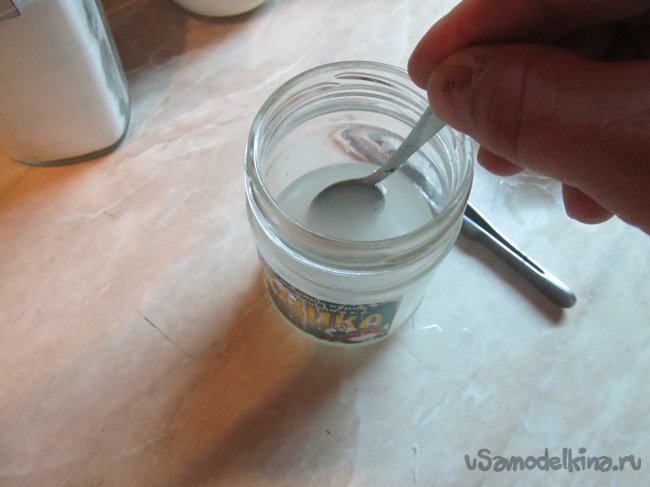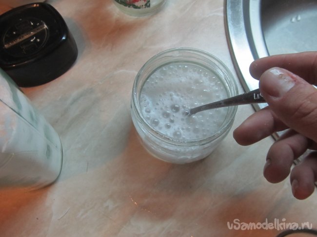 Насыпаем туда простую соду. Много не нужно на 100-200 мл 1-2 ложки соды и хорошо перемешиваем, должна начаться реакция