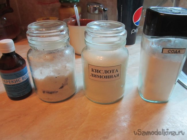 Далее наливаем в другую тару Перекись 100 мл,3-4 ложки лимонной кислоты и 2 ложки соли.