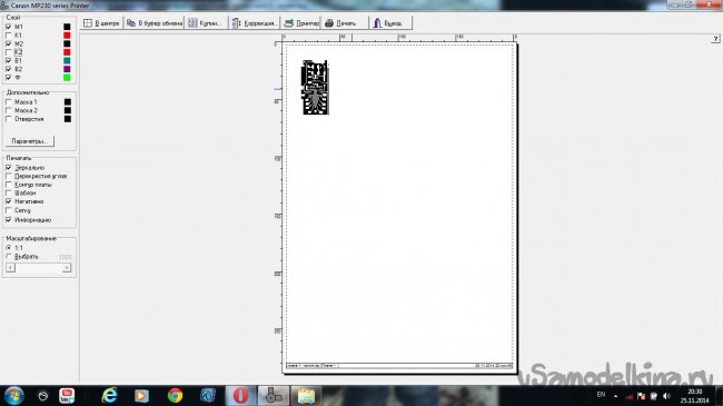 Обязательно слева выставляем все галочки так как на фото. На фото видно, что рисунок у нас в негативном изображении, так как фоторезист у нас негативный, те участки на которые попадет УФ лучи и будут дорожками, а остальное смоется, но об этом немного позже.