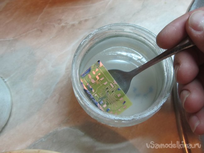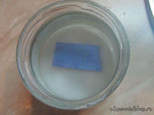 Теперь нам нужно удалить с платы не засвеченный фоторезист, его нужно удалять в растворе кальцинированной соды. Если ее нет то нужно ее сделать. Кипятим воду в чайнике и наливаем в тару