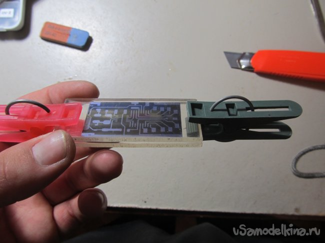 На плату кладем наш распечатанный шаблон, обязательно нужно класть шаблон напечатанной стороной на текстолит и зажимаем между двух половинок оргстекла так чтобы все плотно прилегало