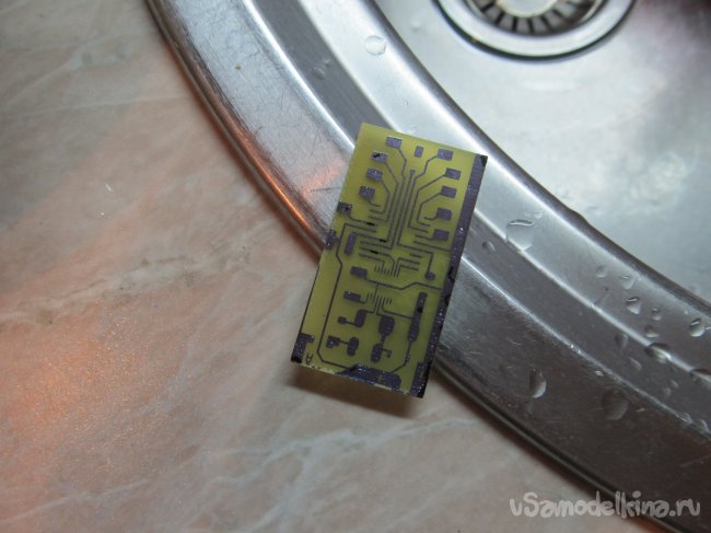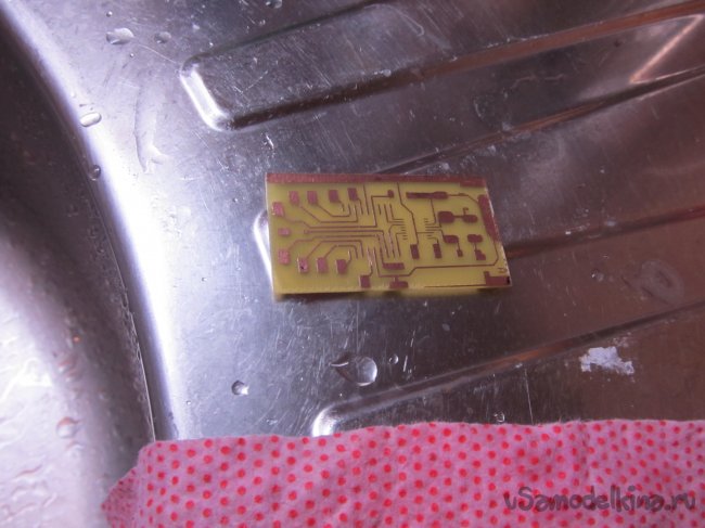 Периодически достаем плату и промываем ее под струей воды счищая с нее аккуратно пальцем или мягкой кухонной губкой. Когда все лишнее смоется должна остаться вот такая плата