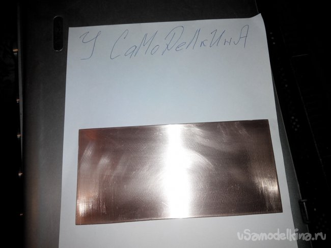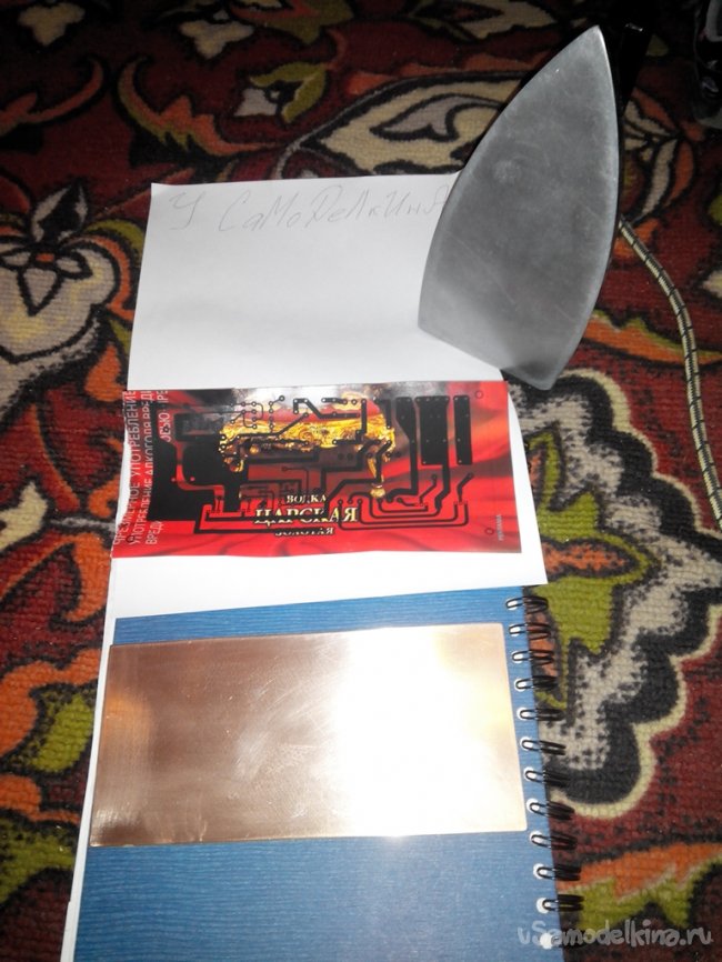 Утюг нужен обычный, не с паром или какими-нибудь там прибамбасами, а обычный настоящий утюГ. Чтобы его подошва была ровная. Далее накладываем распечатку с принтера на медную поверхность, переворачиваем и кладем на что-нибудь плотное (я использовал журнал для записей с твердой коркой). Проглаживаем, чтобы бумага немного прилипла и теперь опять переворачиваем бумагой к верху.