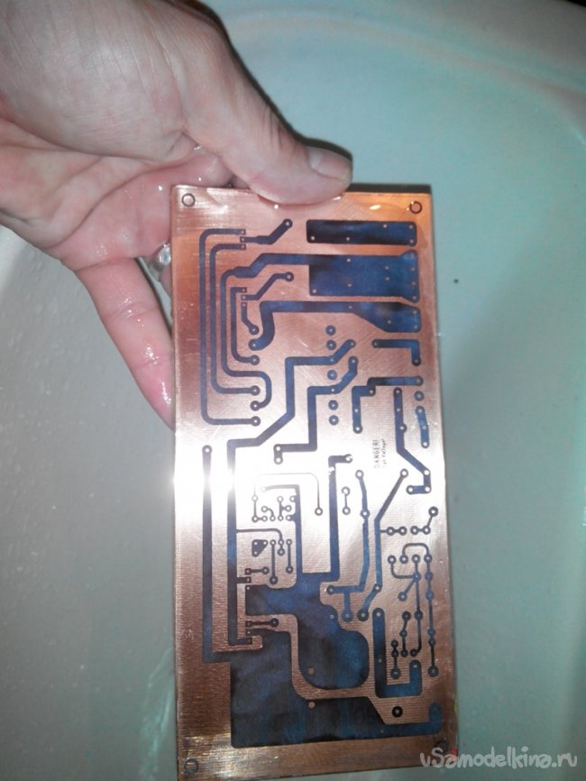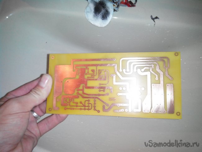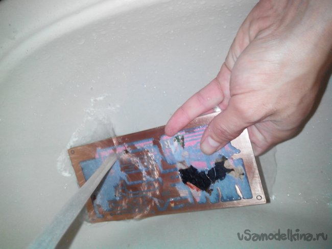Далее под теплой водичкой (после того как плата остыла) смываем с нее бумагу немного потирая, но не усердствуя слишком. Можно немного потереть старой или соседской зубной щеткой (пока он спит) те части платы, где должны быть отверстия.