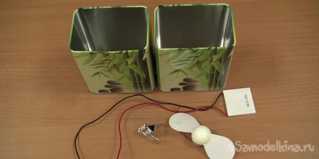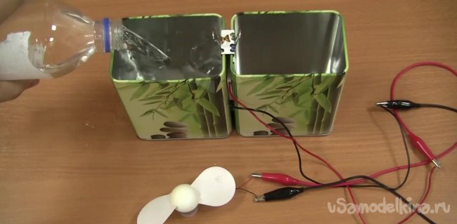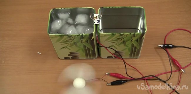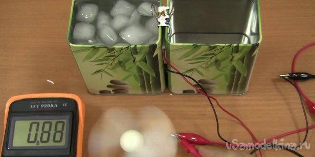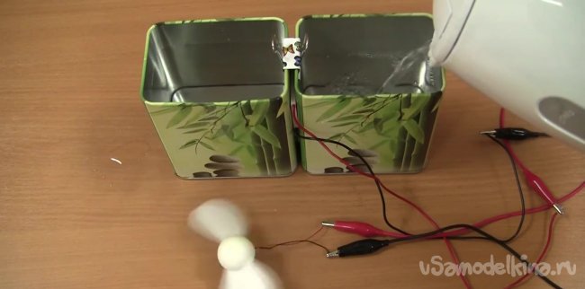 Уже в процессе наполнения второго контейнера моторчик начнет работать, вращая пропеллер. Уникальность конструкции в том, что чем больше будет разница температур воды в двух резервуарах, тем больше будет вырабатываться энергии. Например, если добавить в первую емкость с холодной водой немного льда, моторчик начнет вращаться быстрее. При этом будет вырабатываться примерно 1 вольт энергии. Моторчик может вращаться более 40 минут.