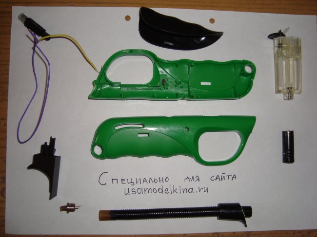 Отделим гибкую гофрированную трубку, снимем с неё железный колпачок и достанем изнутри трубочку для газа и провода от пьезоэлемента.