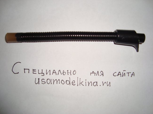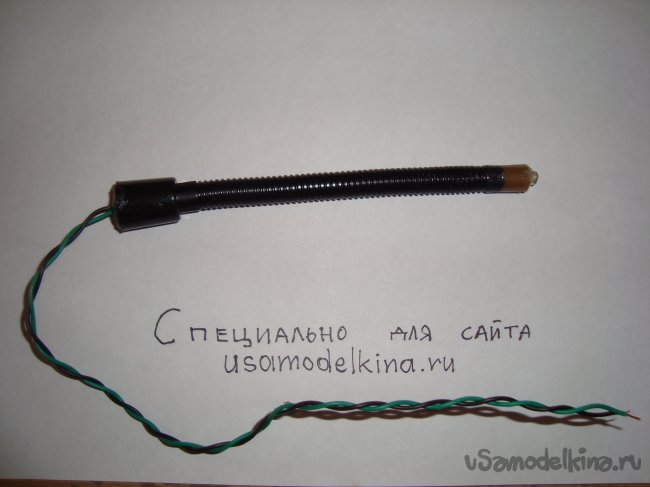Припаяем к светодиоду 2 провода (плюс и минус), вставим светодиод с проводами в гофрированную трубку и закрепим светодиод на конце термоклеем, так чтобы светодиод был снаружи, а проводов и ножек светодиода не было видно.