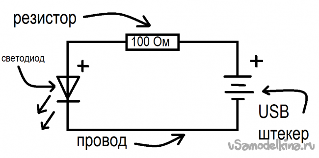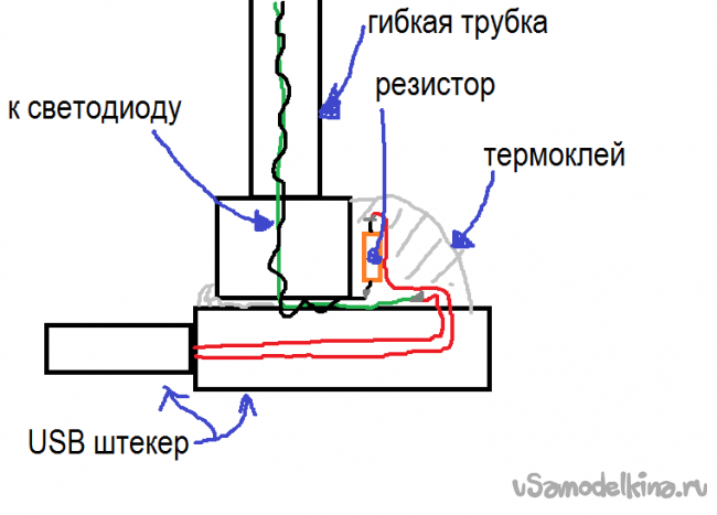 С помощью термоклея приклеиваем гибкую гофрированную трубку с светодиодом и проводами к USB штекеру и максимально компактно спаиваем с резистором по схеме: