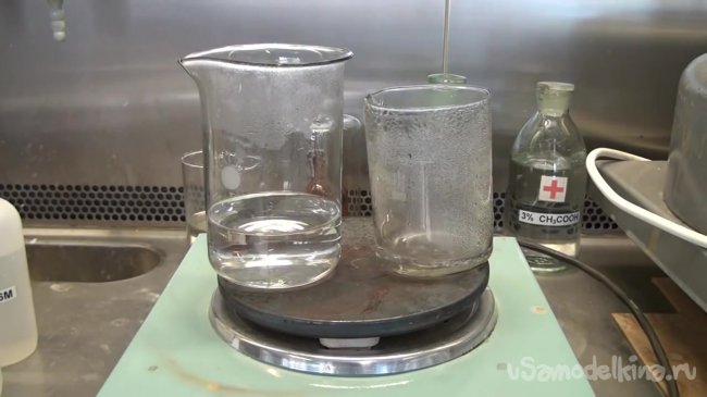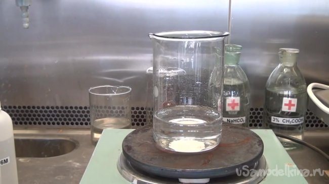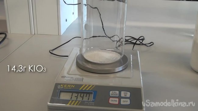 Для того, чтобы приготовить второй раствор нам понадобится взвешивать вещества. Берем большой стакан и отмеряем в него 14.3 гр. иодата калия. Далее приливаем в стакан 200 мл дистиллированной воды. Так как растворимость иодата калия в воде не очень высокая, то для того, чтобы ускорить растворение нагреваем смесь на плите.