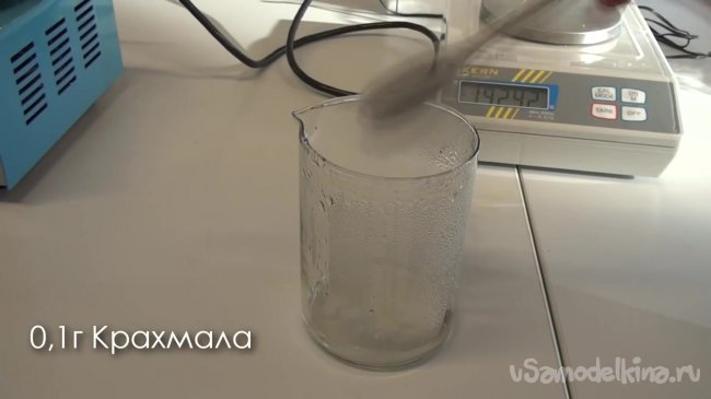 Берем еще один стакан с горячей водой и отмеряем туда примерно 0.1 г картофельного крахмала. Крахмал также не очень хорошо растворяется в воде, поэтому способствуем этому процессу, положив стакан на плиту примерно на 10 минут. После этого у нас должен получиться, так называемый, крахмальный клей, который мы должны вылить в стакан с третьим раствором.