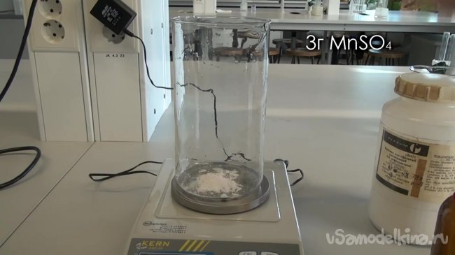 Приготовим третий раствор. Для этого возьмем большой стакан и отмерим туда 3 гр сульфата марганца.