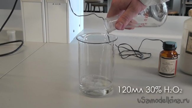 Для проведения реакции нам нужно сначала приготовить три раствора. Первый раствор довольной простой. Берем большой стакан и наливаем в него 120 мл 30 процентной перекиси водорода. После этого добавим 210 мл дистиллированной воды. Первый раствор готов.