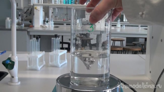 Берем большой стакан с третьим раствором, ставим на магнитную мешалку и включим мешалку.