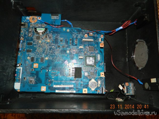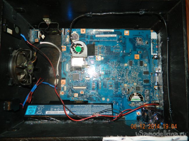 Подключил все провода от устройств ввода и вывода, подвел питание к куллерам и радуюсь. Главная цель, а именно Охлаждение процессора и видеокарты, достигнута! Плата ноутбука в новом корпусе себя чувствует очень хорошо. Температуры значительно понизились, да и чистить СО теперь будет легче.
