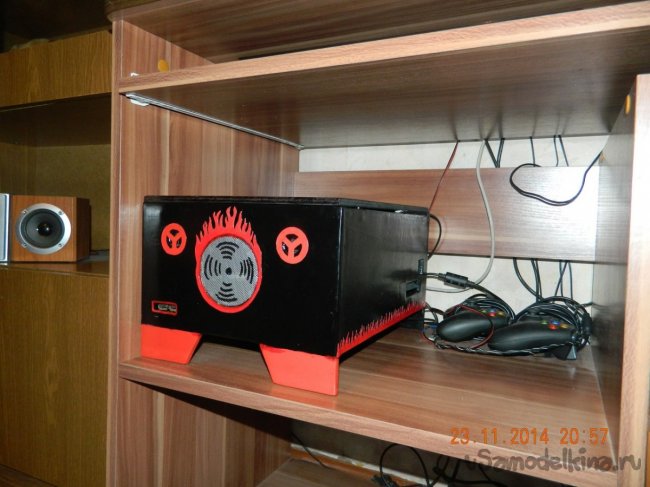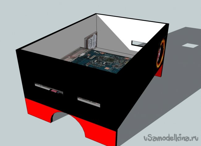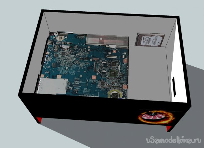 Потом приклеил с помощью термоклея родные динамики, USB порты и куллер на выдув, а на вдув прикрутил снизу с фильтром из марли(соединил с зажимами проводов на задней панели). Вырезал из сетки от динамика круг и приклеил термолкеем на отверстие под куллер на передней панели - будет служить "грилем" на вентилятор. Жесткий диск крепится к плате и поэтому пришлось его с одной стороны обмотать изолентой. Сделал подпорку для HDD и приклеил к корпусу. Изначально хотел HDD вынести на боковую стенку, но не нашел шлейфов.