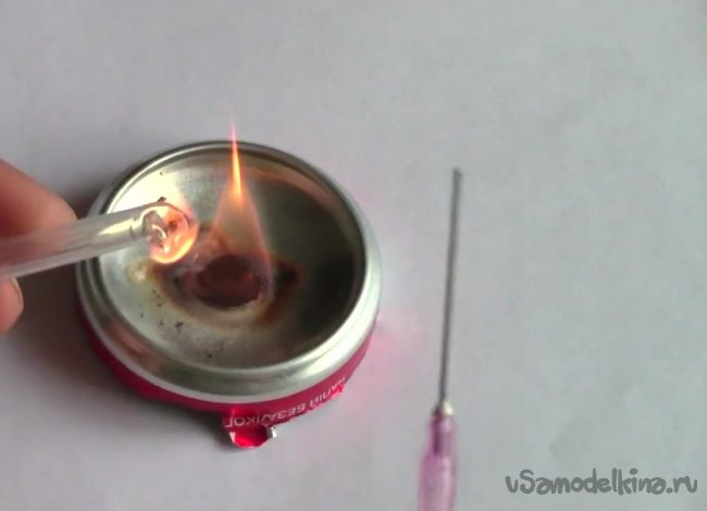Далее нагреваем любой кусок пластмассы до текучего состояния и забываем ей отверстие иглы.