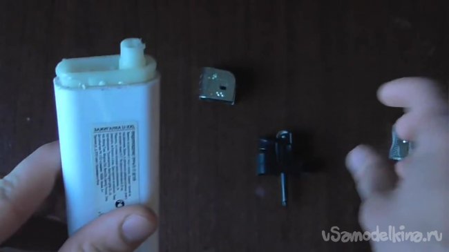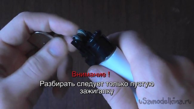 Предупредим сразу, что зажигалка, из которой нужно сделать точилку, должна быть полностью пустой, чтобы избежать возможных травм. Начинаем с разборки зажигалки.