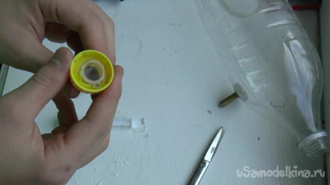 Теперь берем крышку от бутылки, поскольку к ней нам нужно приделать шприц.