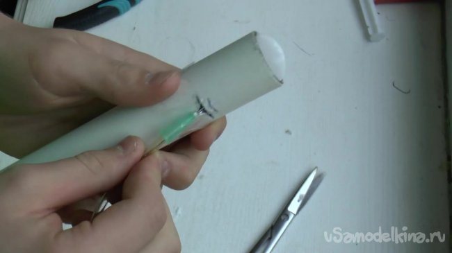 Далее к трубке нужно приделать иголку, которую слегка гнем, просовываем в пропил и фиксируем клейкой лентой.