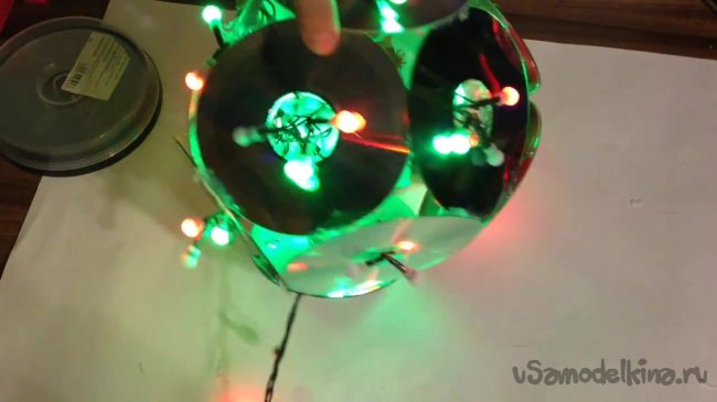 Когда гирлянда прикреплена, приступаем к следующему шагу, а именно – к изготовлению еще одной полностью идентичной конструкции из шести дисков.